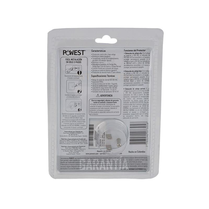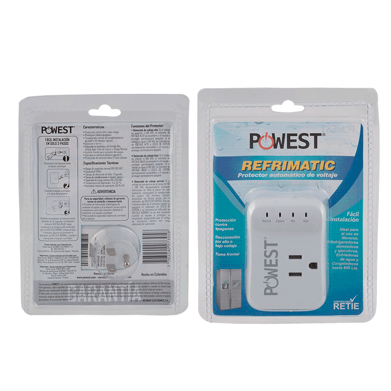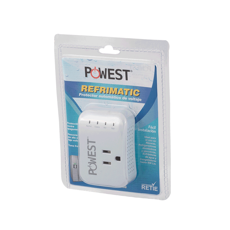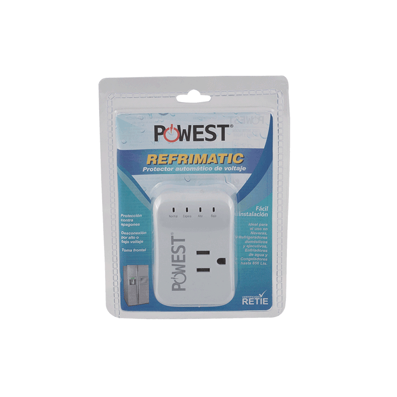 Los protectores de voltaje Powest Refrimatic están diseñado para proteger sus equipos de refrigeración como neveras y nevecones en capacidades hasta de 800 Litros, protección de voltaje desconexión por alto y bajo voltaje, ciclo de espera de 4 minutos toma de salida nema 5-15r.